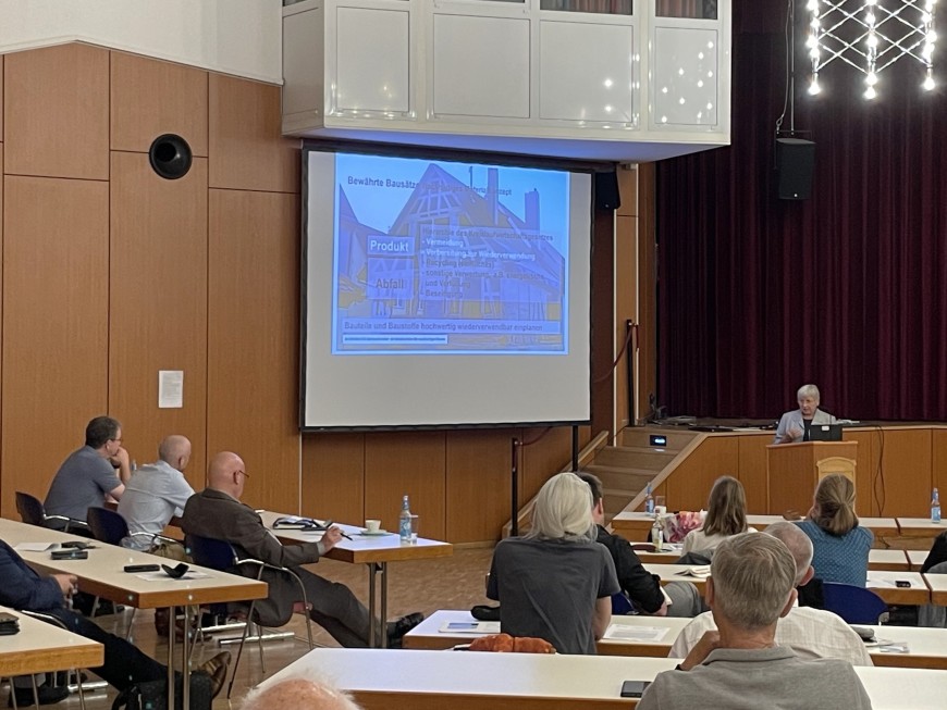 Es folgte ein Vortrag zum Thema „Kreisläufe schließen – Hochwertiger Wiedereinsatz von Baumaterial“ der Architektin Ute Dechantsreiter aus Bremen vom Bundesverband bauteilnetz Deutschland e. V.. Sie ist die Gründerin der ersten Bauteilbörse in Deutschland überhaupt und konnte aus einem reichen Erfahrungsschatz berichten. Anschließend referierte der Architekt Dr. Martin Zeumer von der ee concept GmbH über „Gebäudebezogene Umweltwirkungen: Die Rolle der Wiederverwendung von Bauteilen“. Auch er betonte: „Wir können nur bestehen, wenn wir Überzeugungstäter sind.“ Gerade Architekt*innen sollten Ausschreibungen nutzen, um Recycling zu unterstützen. Er zeigte auf, wie man den Lebenszyklus eines Bauteils und eines Gebäudes optimieren kann.